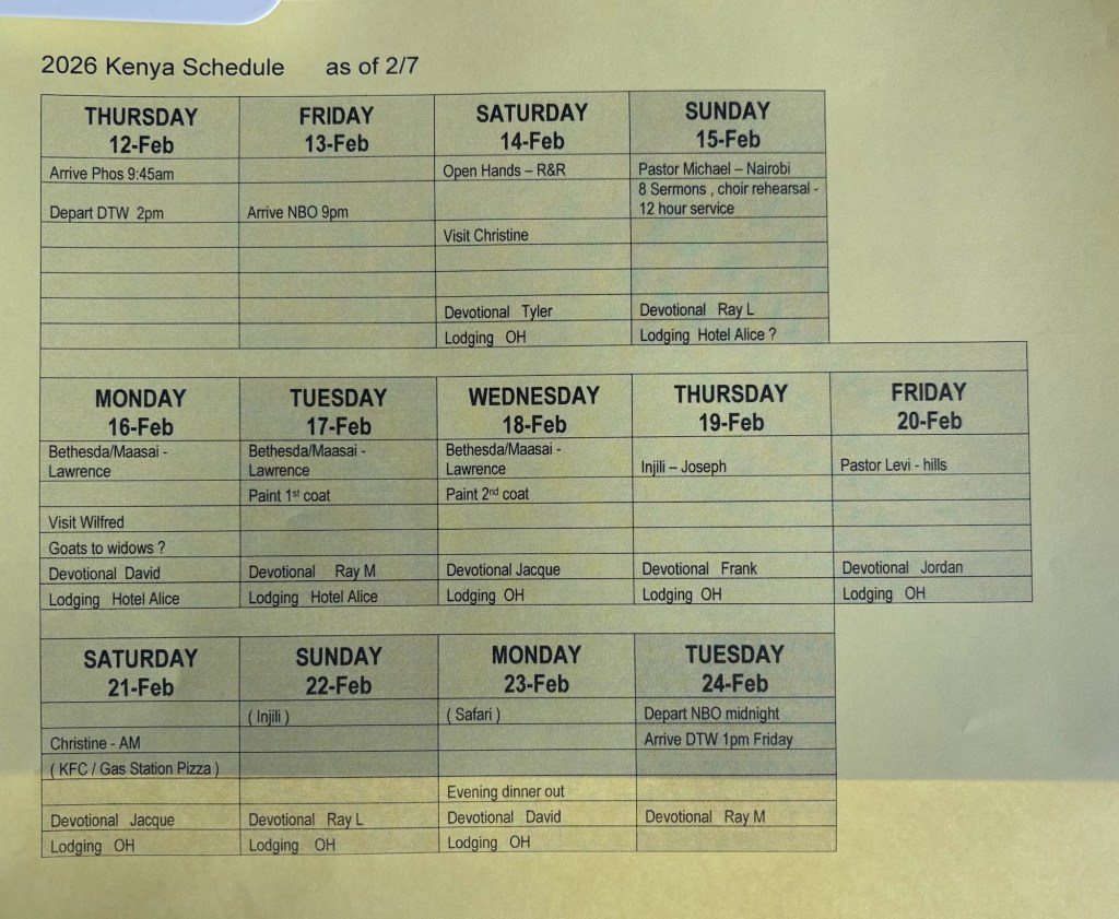 Itinerary for Kenya Trip February 12- February 24, 2026 Share this: Share on X (Opens in new window) X Share on Facebook (Opens in new window) Facebook Like Loading...